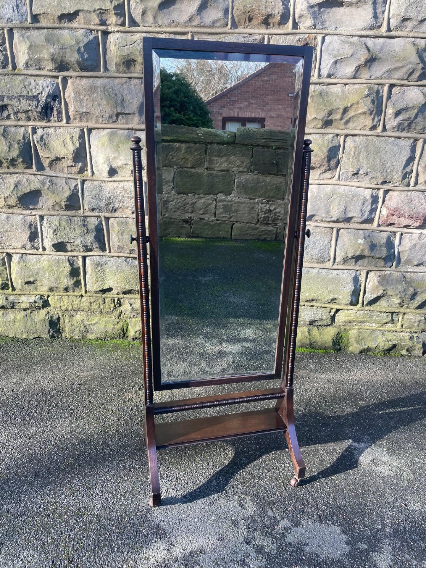 Offered for sale is this nice quality antique cheval dressing mirror. Oak mirror with bevelled edge mirror plate, oak uprights with turned finials & beaded decoration, brass screw in handles to support the mirror. Standing on shaped oak legs with a stretcher & castors. The angle of the mirror can be adjusted by pushing backwards or pulling forwards.