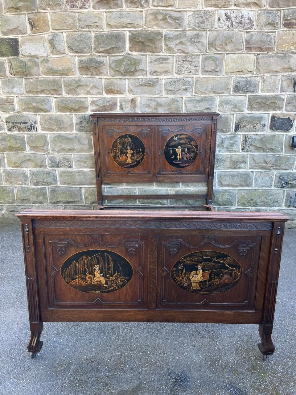 Offered for sale is this antique oak & chinoiserie decorated double bed. Made from solid oak having panelled head & footboard, oval black lacquered chinoiserie decorated panels, carved decoration. Standing on raised feet with castors. Metal side rails which bolt in place. The bed splits into 4 pieces, headboard, footboard and 2 side rails. Standard double mattress.