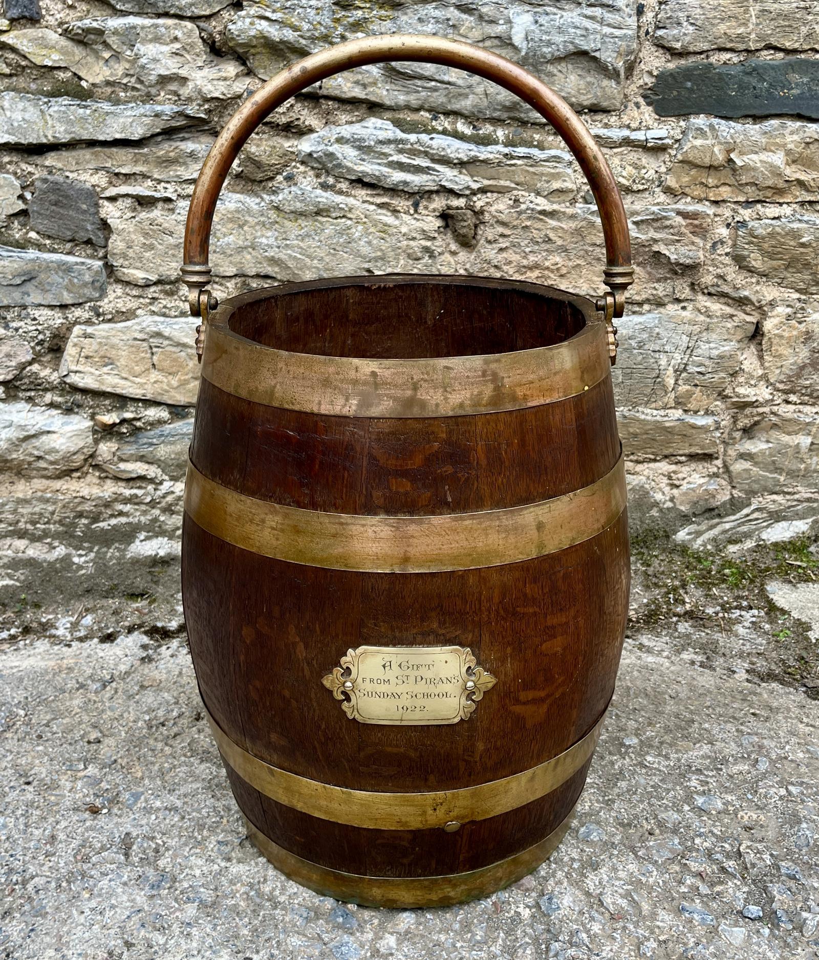lovely antique coopered oak bucket dating from the early 20th century. It is very well made with brass bound strapping and a brass swing handle. It has a brass plaque on the front which is engraved "A Gift from St Piran's Sunday School. 1922".