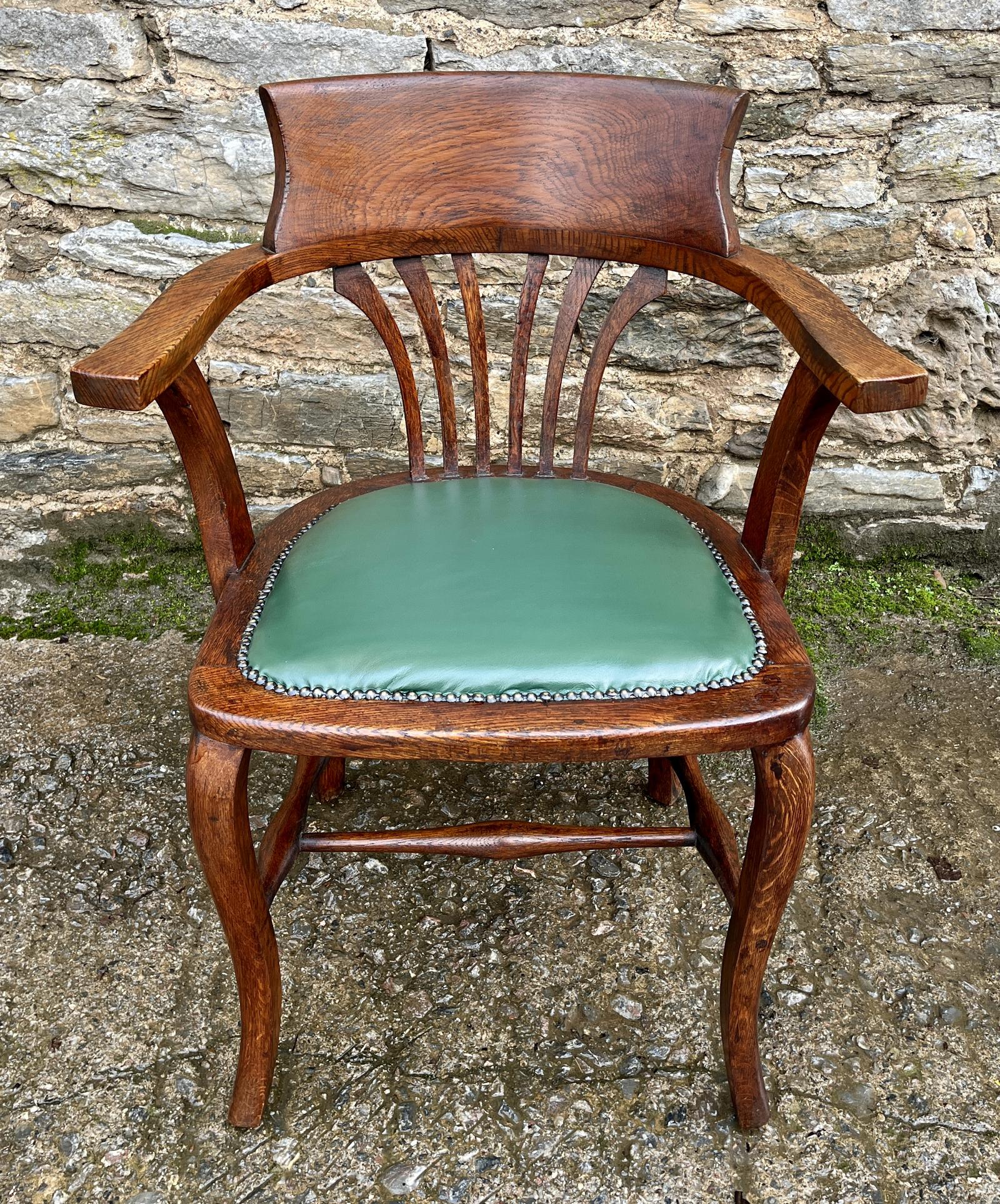 A lovely oak desk chair dating from the early 20th Century. It is a good comfortable chair and very well made with an upholstered leather seat with a studded border. It stands on nicely shaped legs joined by a double stretcher.