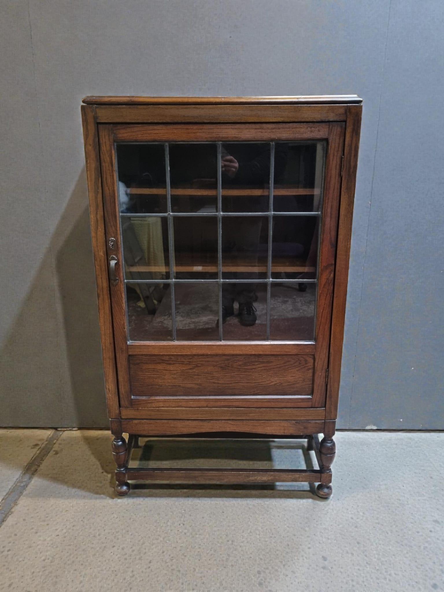 This elegant piece features a single glazed door with classic leaded glass panels, allowing a beautiful display of books, decorative objects, or collectables.