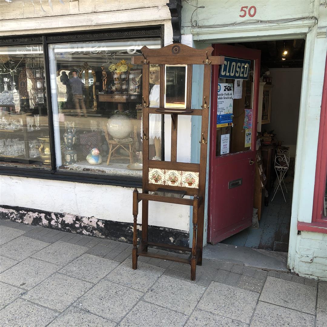 Antique Oak Hall Stand with Tile Back 1910s