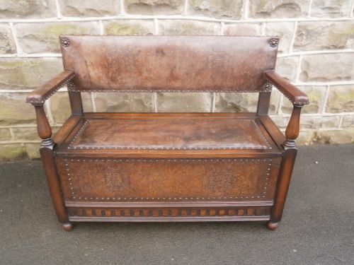 Antique Oak & Leather Hall Seat Bench Settle c.1900