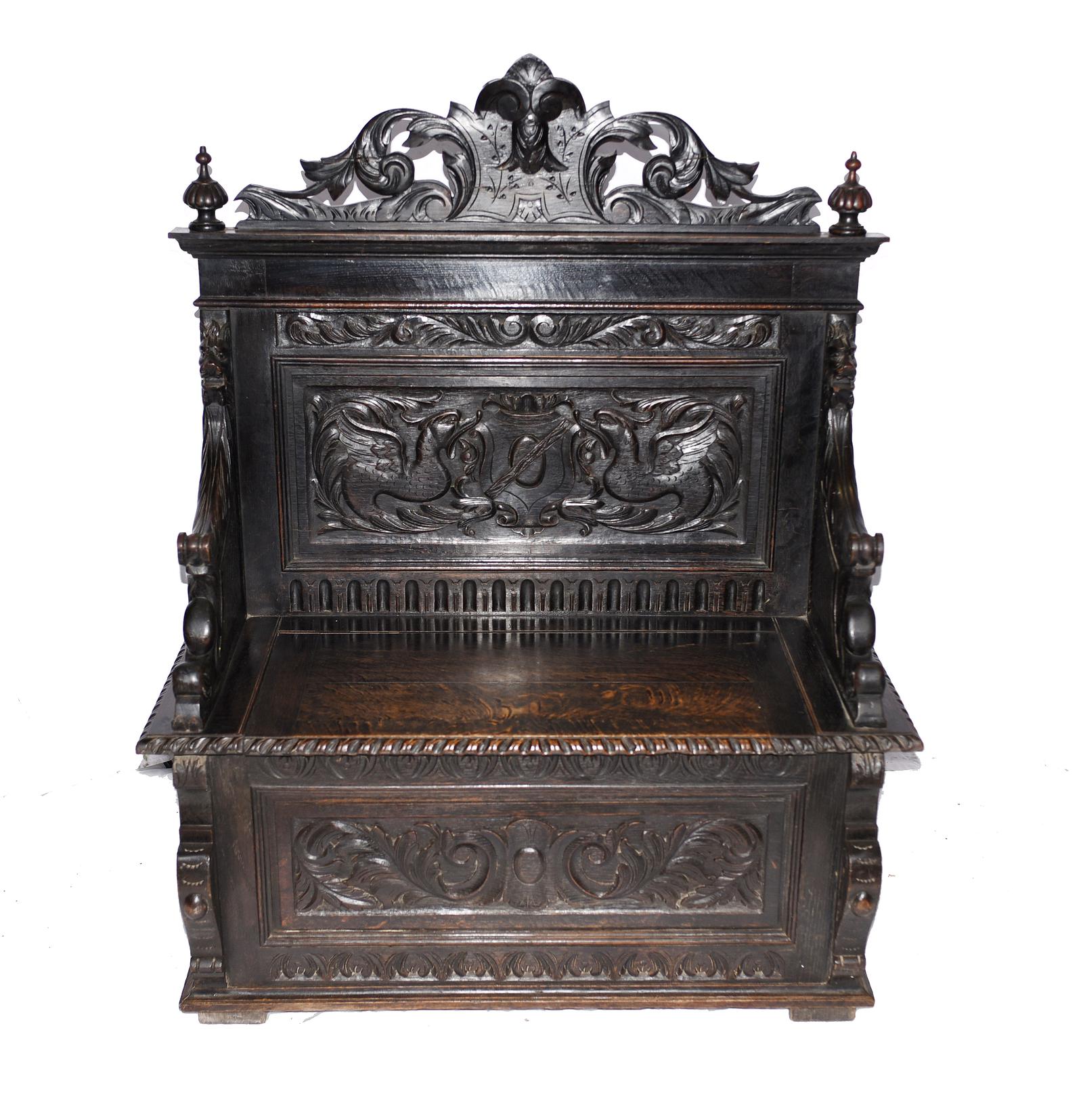 Antique Oak Monks Bench Settle - Carved Farmhouse Hall Seat
