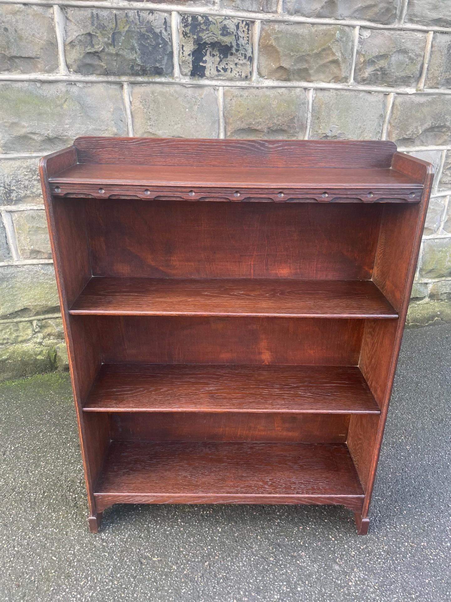 Offered for sale is this antique oak open bookcase. Made from solid oak, raised gallery back, 4 fixed height oak shelves with shaped cut out feet. Polished oak sides.