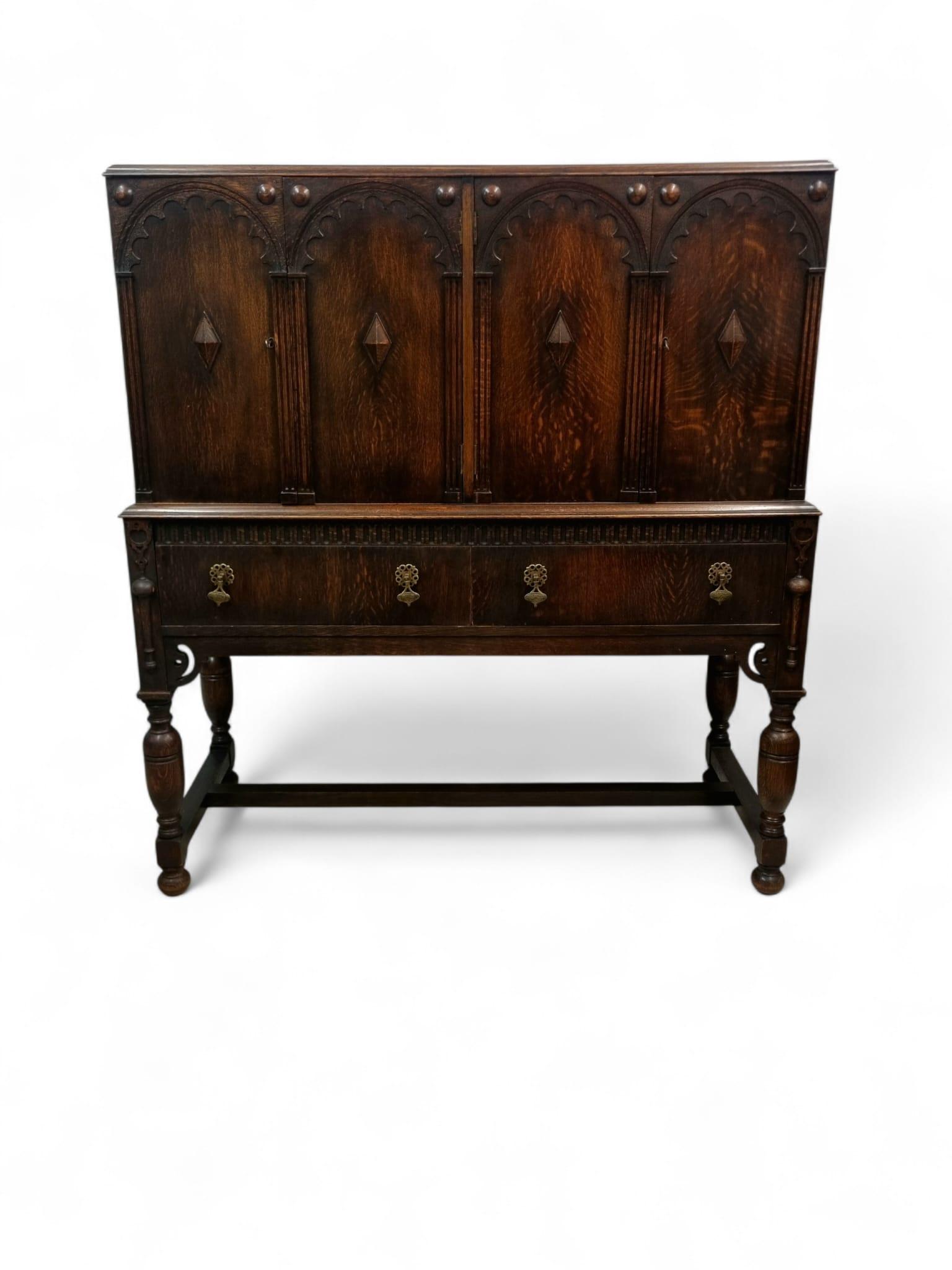 The upper section features four panelled cupboard doors with elegant arched detailing and geometric diamond carvings, opening to reveal shelved storage ideal for crockery, books, or household linens. Below, there are four drawers, including divided cutlery compartments, all fitted with original brass handles.