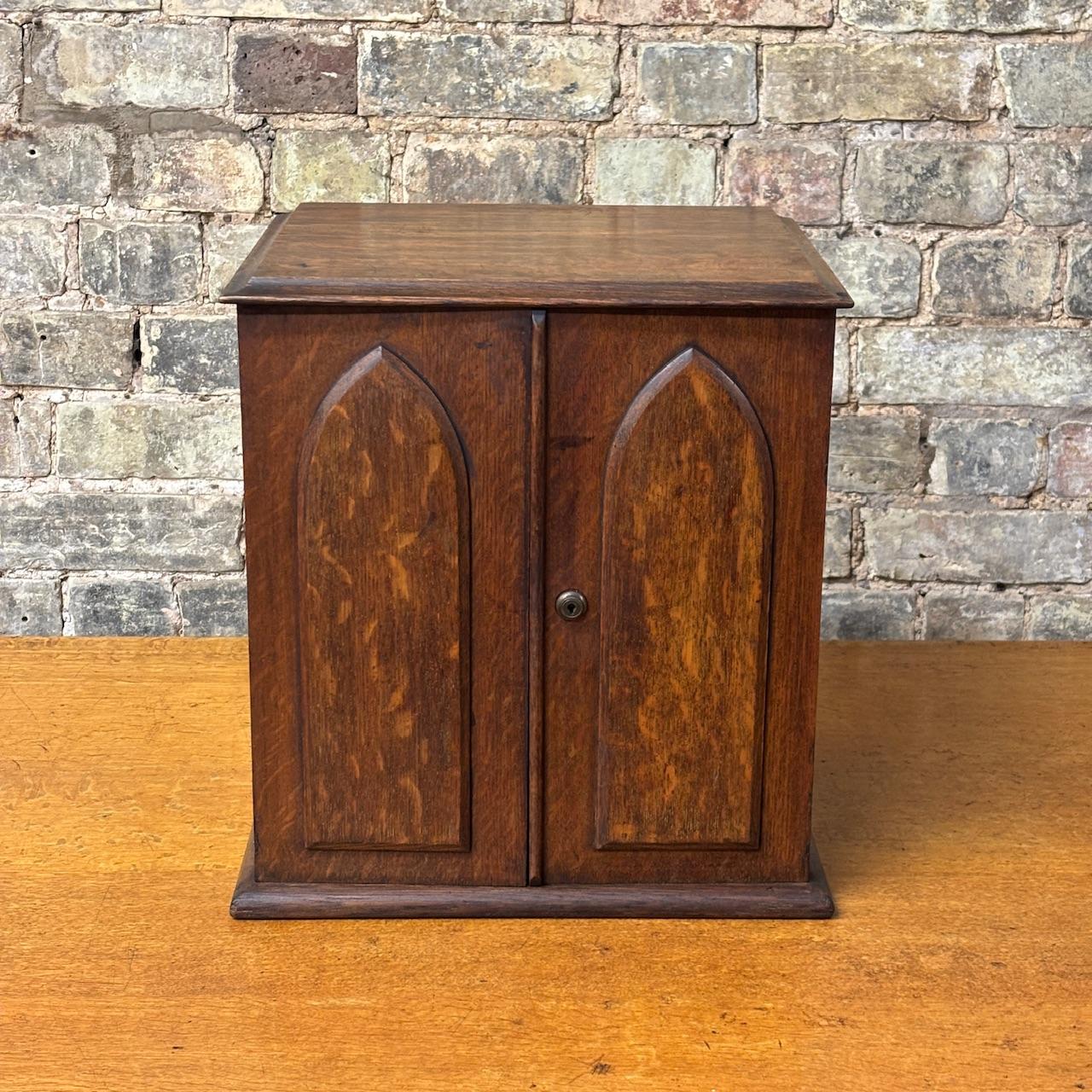 The cabinet is beautifully made in solid oak, with a rich, warm tone and striking grain throughout. The front features a pair of panelled doors with Gothic-style arched detailing, opening to reveal an arrangement of six small drawers. b