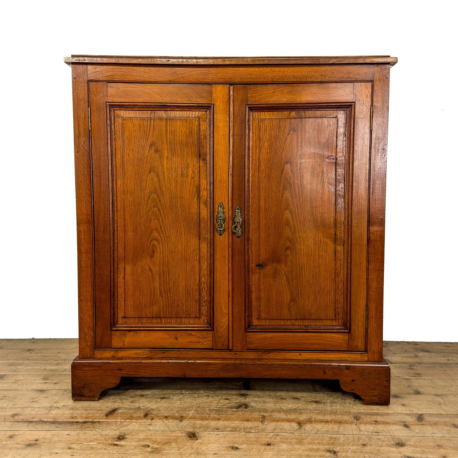 A well presented antique oak two door cupboard. The cupboard features a rectangular top above a pair of panelled doors, opening to reveal a spacious interior fitted with fixed shelves, ideal for storage. Constructed from oak with a warm, rich colour and attractive grain throughout. Raised on a shaped plinth base, giving it a solid and balanced appearance. A practical and versatile piece, suitable for a variety of interiors.