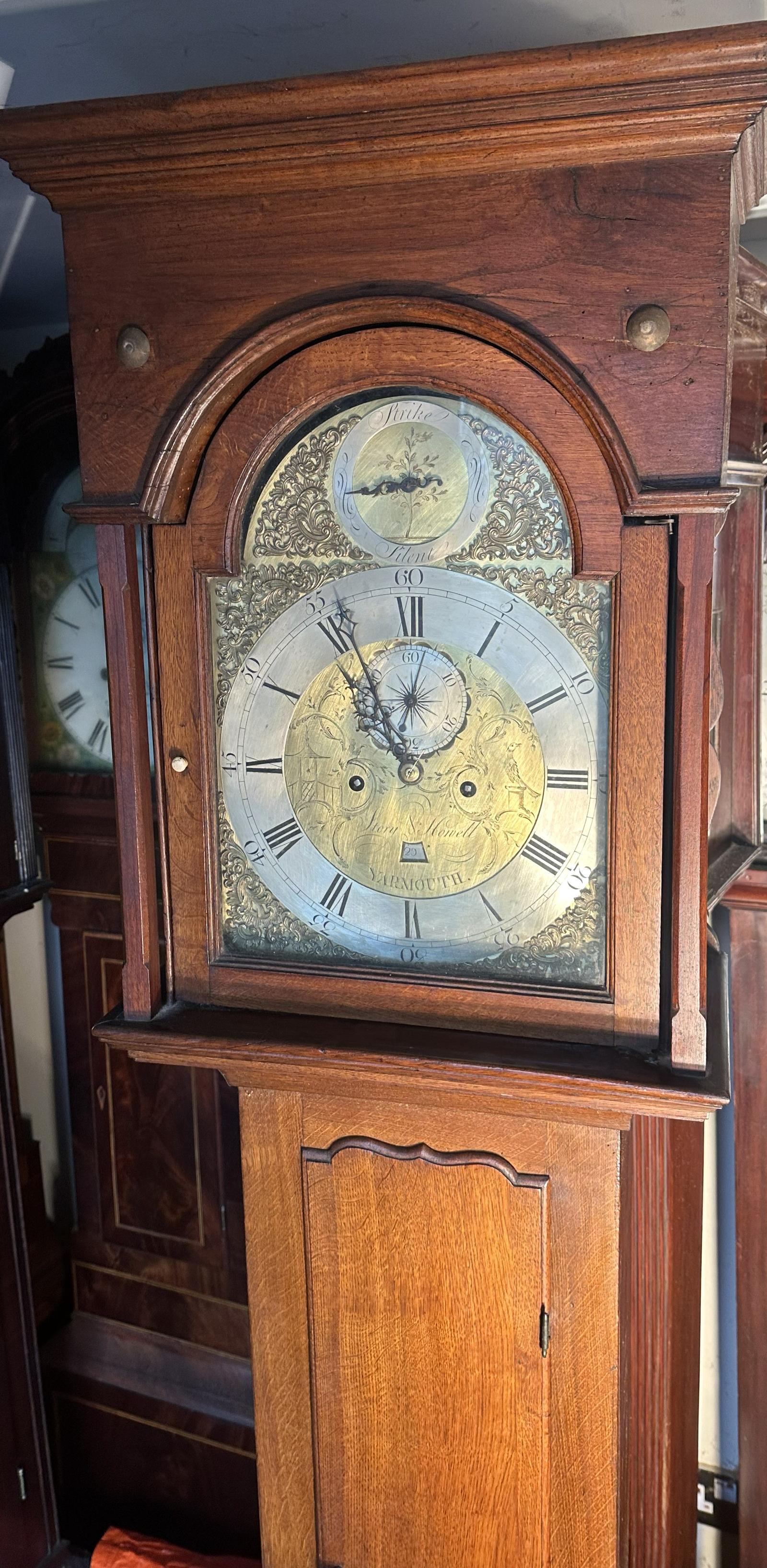 The slim oak longcase Grandfather clock with a long trunk door case and an arched hood. It has a 12" brass and silvered dial signed "Story Howell of Yarmouth" that is found listed as dated 1840. It has a strike and silent leaver in the arch. It has an 8 day striking movement which is in good working order. It has weights winding key and pendulum. It stands just over 84" high.