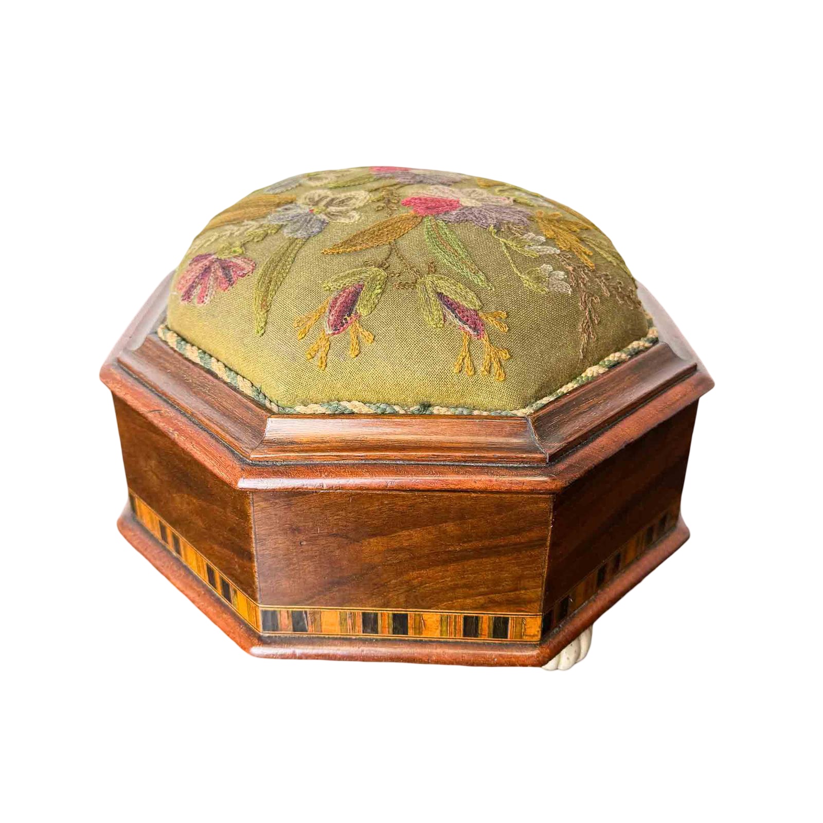 The cover is a little faded and has some marks, but all the embroidery is intact. The padding to the lid is firm and I suspect is the original horsehair. The lid doesn’t sit perfectly level on the body - this is more obvious in the photos than it is in the flesh. I think it would have had four feet originally, and there are some marks on the underside that look as though they might be where the feet were. I suspect one got damaged so they were repositioned to make its work with three feet instead of four. There are a couple of small losses to the inlay. Overall a charming little piece in good condition.