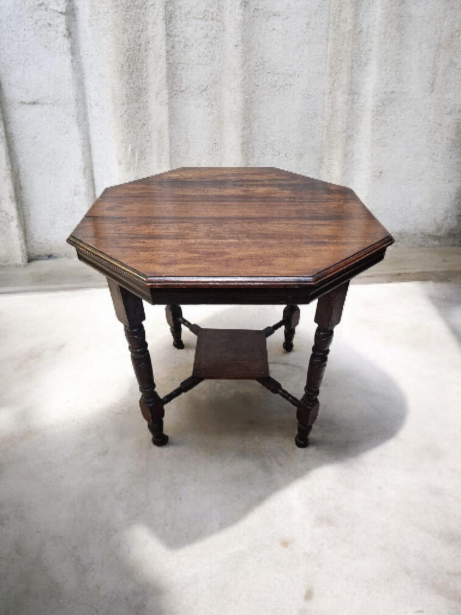 The octagonal top displays attractive grain and natural variation, while the turned legs add elegance and visual rhythm.