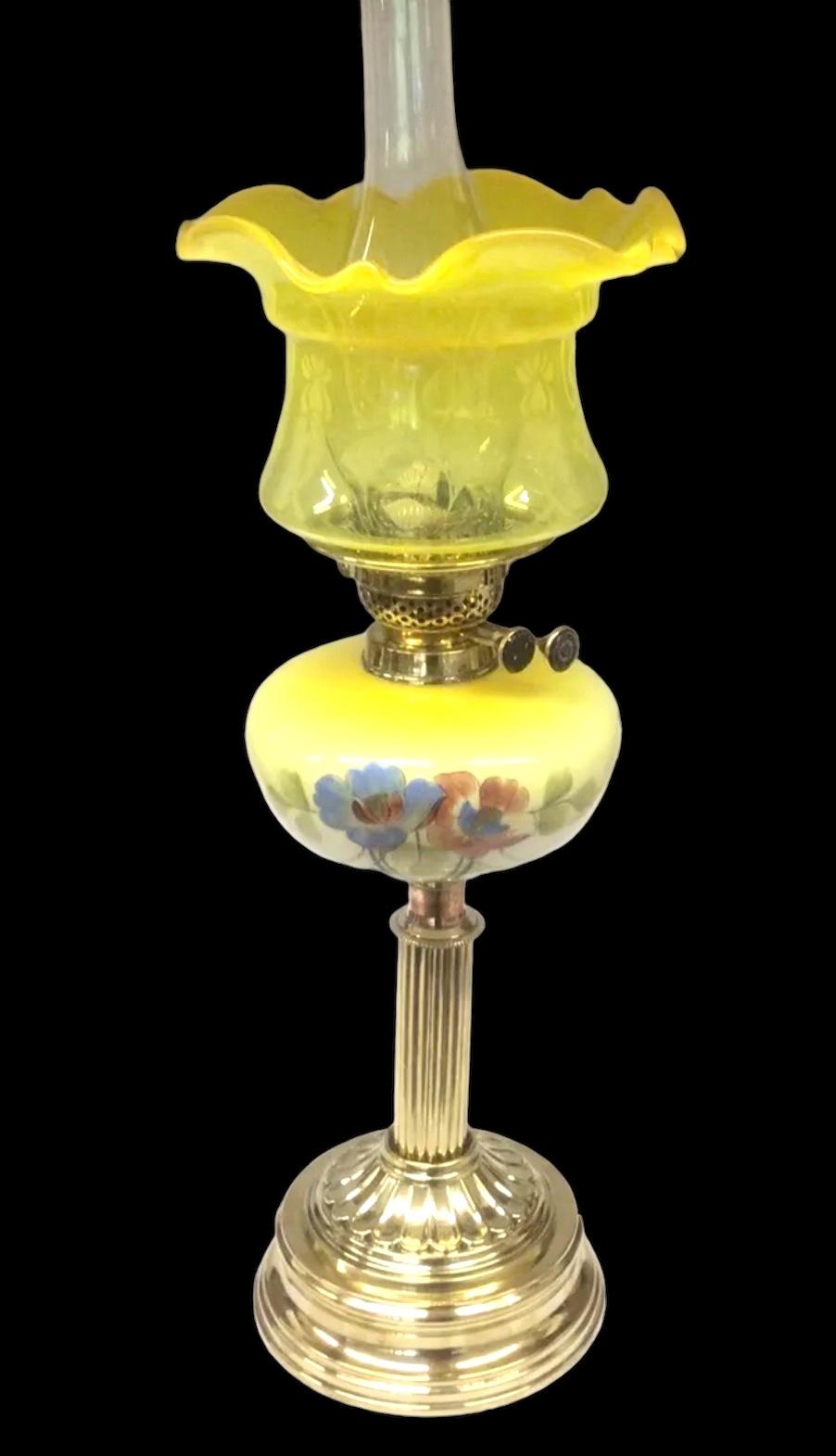 Antique Oil Lamp Duplex Burner Yellow Glass Shade