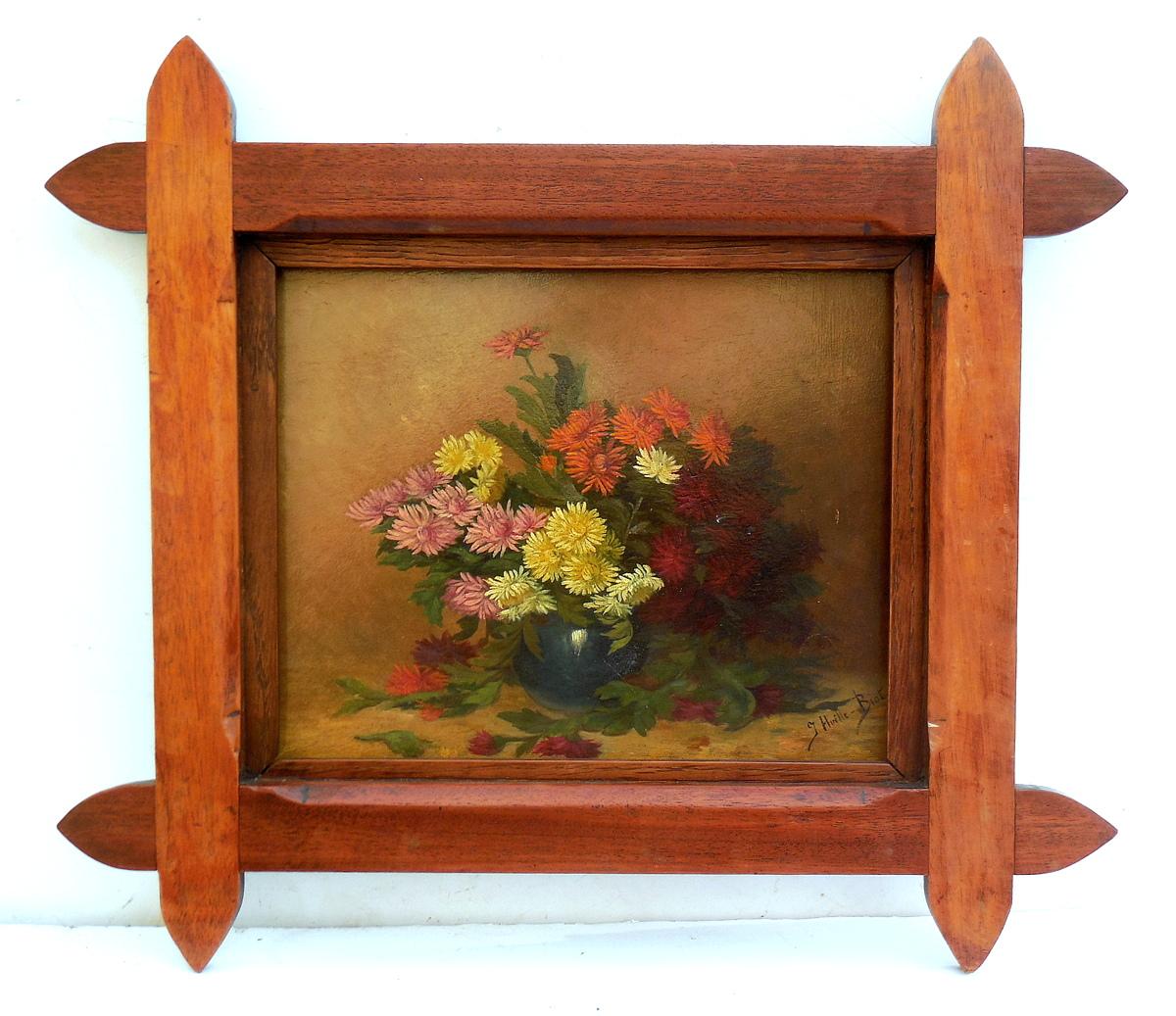 For sale is this lovely oil painting on wood panel of a still life with flowers; dahlias, I believe. It is signed lower right by the artist and I would guess that from the name that the painting is either French or Belgian in origin. I would estimate it was painted around 1880 to 1890. It is framed in a hand-made wood frame which measures about 35 by 40 centimeters at the extremities. Total weight is about 909 grams.
