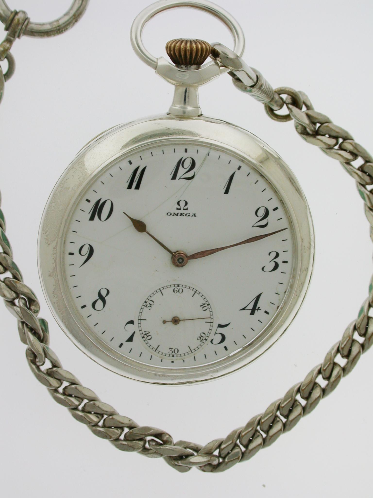 Antique Omega Silver Open Face P/W Swiss 1925 with Chain