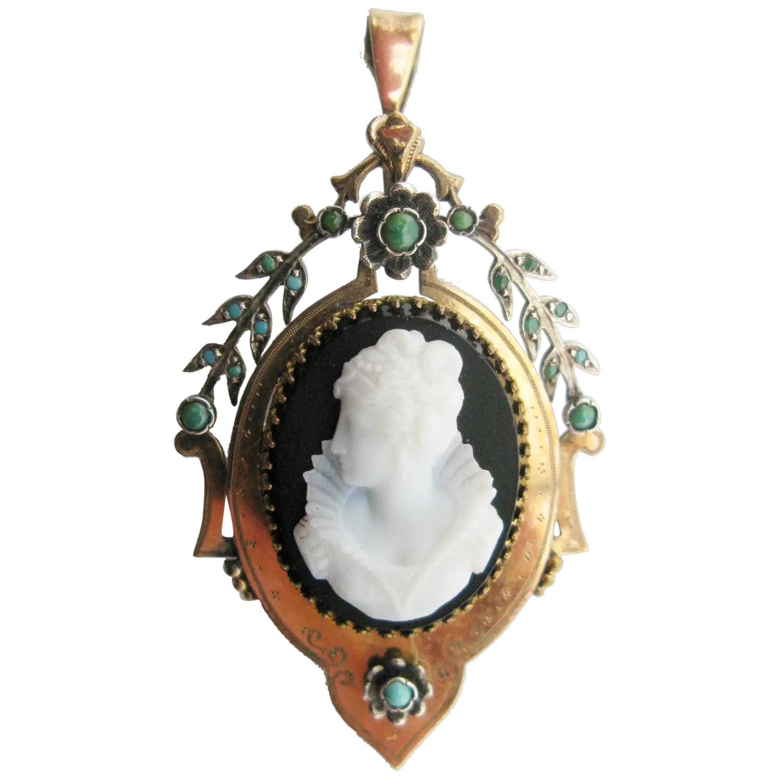 Antique Onyx Cameo Brooch / Pendant Elizabethan Lady