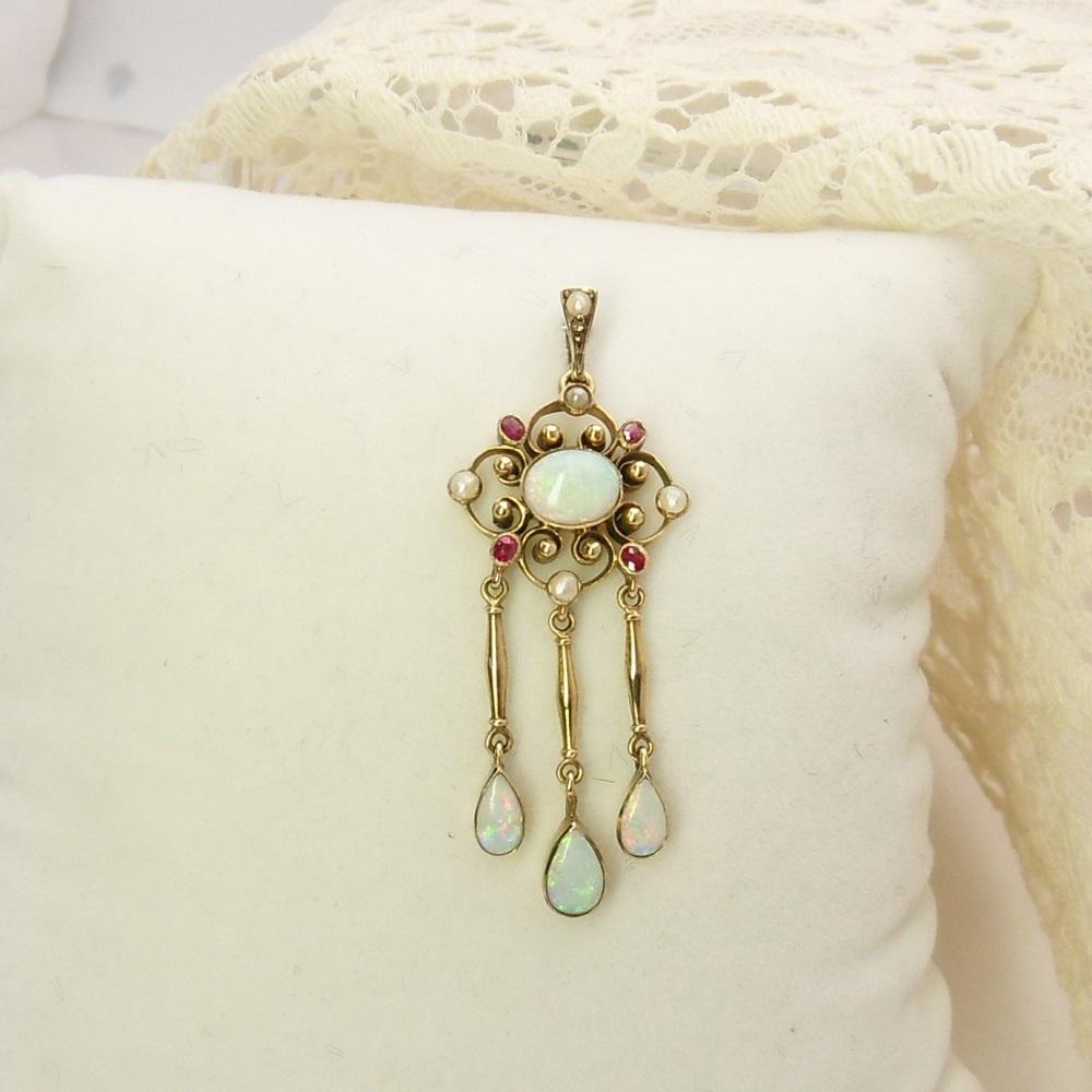 Antique Opal Ruby & Pearl Set Drop Pendant Marked 9ct c.1910