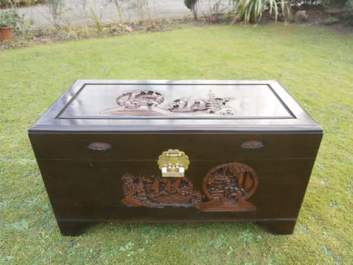 Antique Oriental Carved Camphor Trunk / Chest / Coffer / Blanket Box c.1920