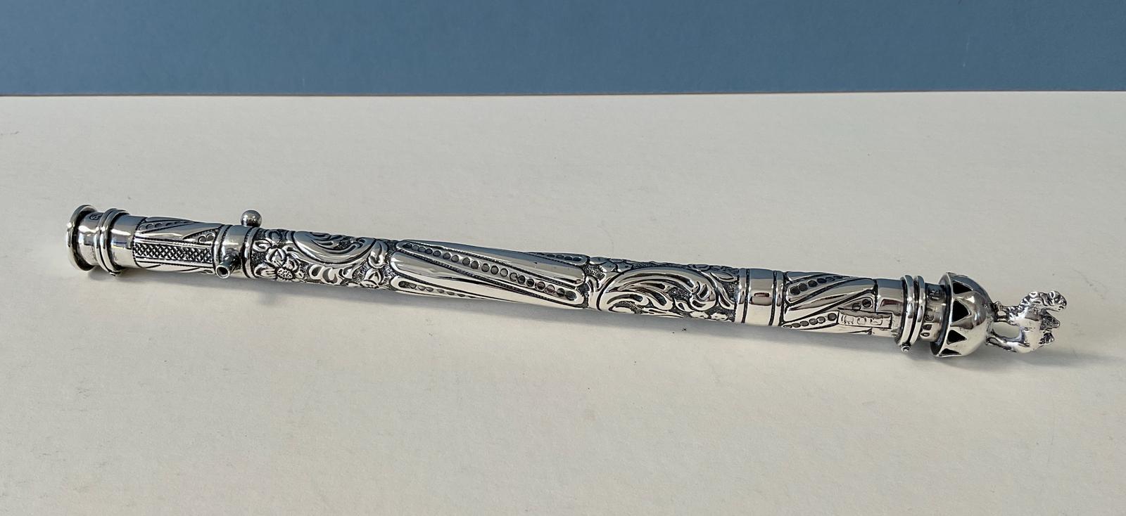 This is gorgeous! a solid sterling silver sealing wax holder dating from the end of the Victorian era. The wax holder is hallmarked for London 1893 with the maker's mark for Samuel Jacob. It is hinged at both ends and topped with an elephant. Up to 6" (15.5cm) of sealing wax can be stored at the elephant end and matches stored at the other end by the match strike. The little tube on the top is for holding a lit match to melt the wax. Fabulous design. Dimensions: Silver Weight: 37g. Length: 22cm. Complimentary gift wrapping is available on request.