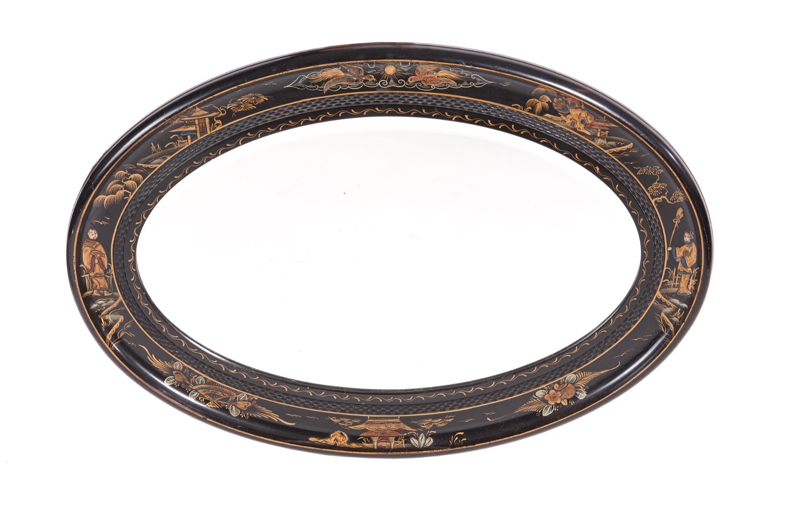 Antique Oval Chinoiserie Lacquered Decorated Wall Mirror c.1910