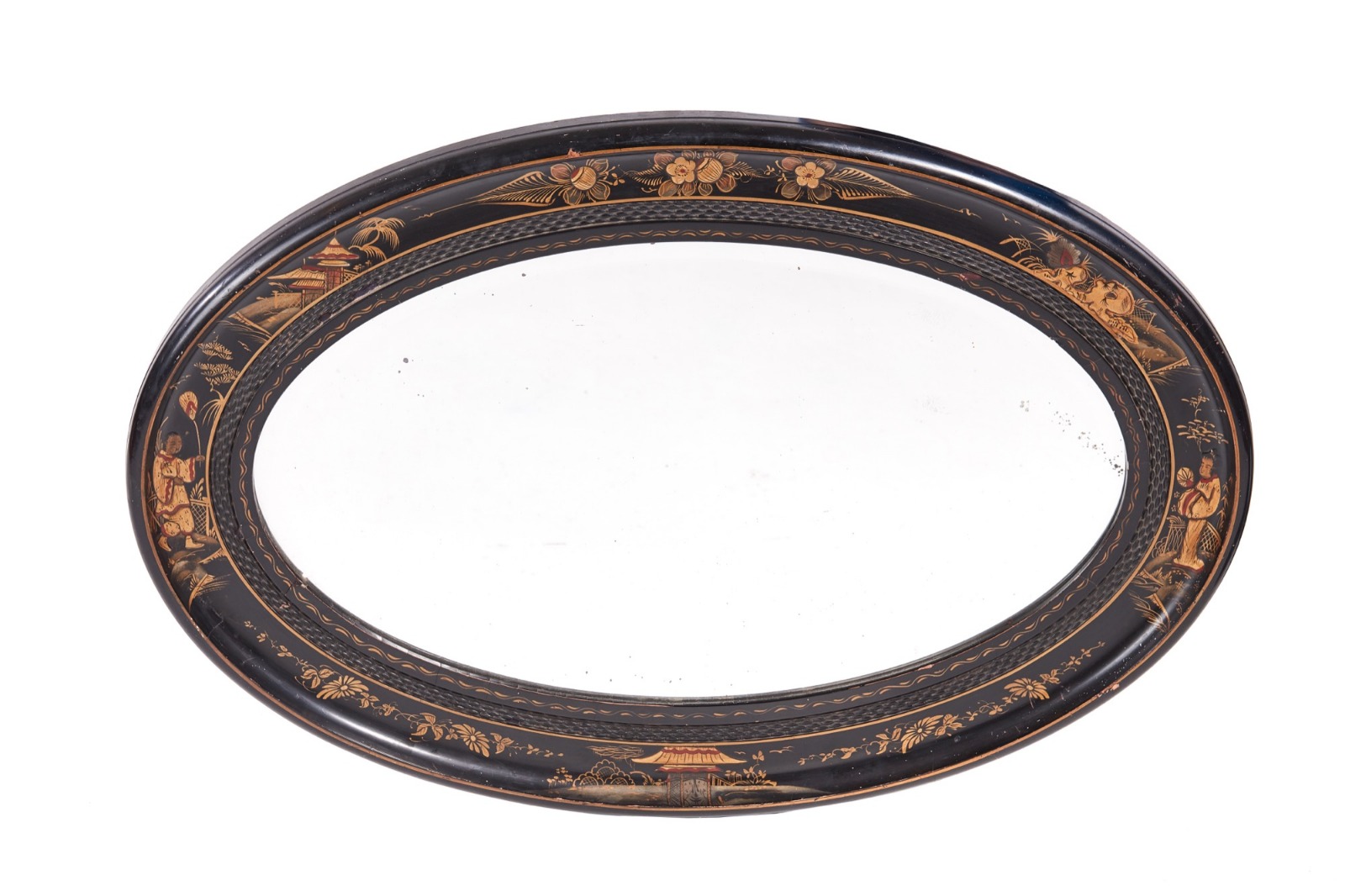 Antique Oval Chinoiserier Lacquered Decorated Wall Mirror
