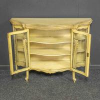 A very unusual French influenced Rococo style side cabinet /credenza from the Late Victorian period. The original cream paint has been applied onto a solid mahogany or walnut and whilst is does have minor scratches here and there it is in generally very good condition. The doors and side panels have wonderful serpentine glazing all undamaged. The lock is working and with the key. A really unusual piece of antique furniture.
