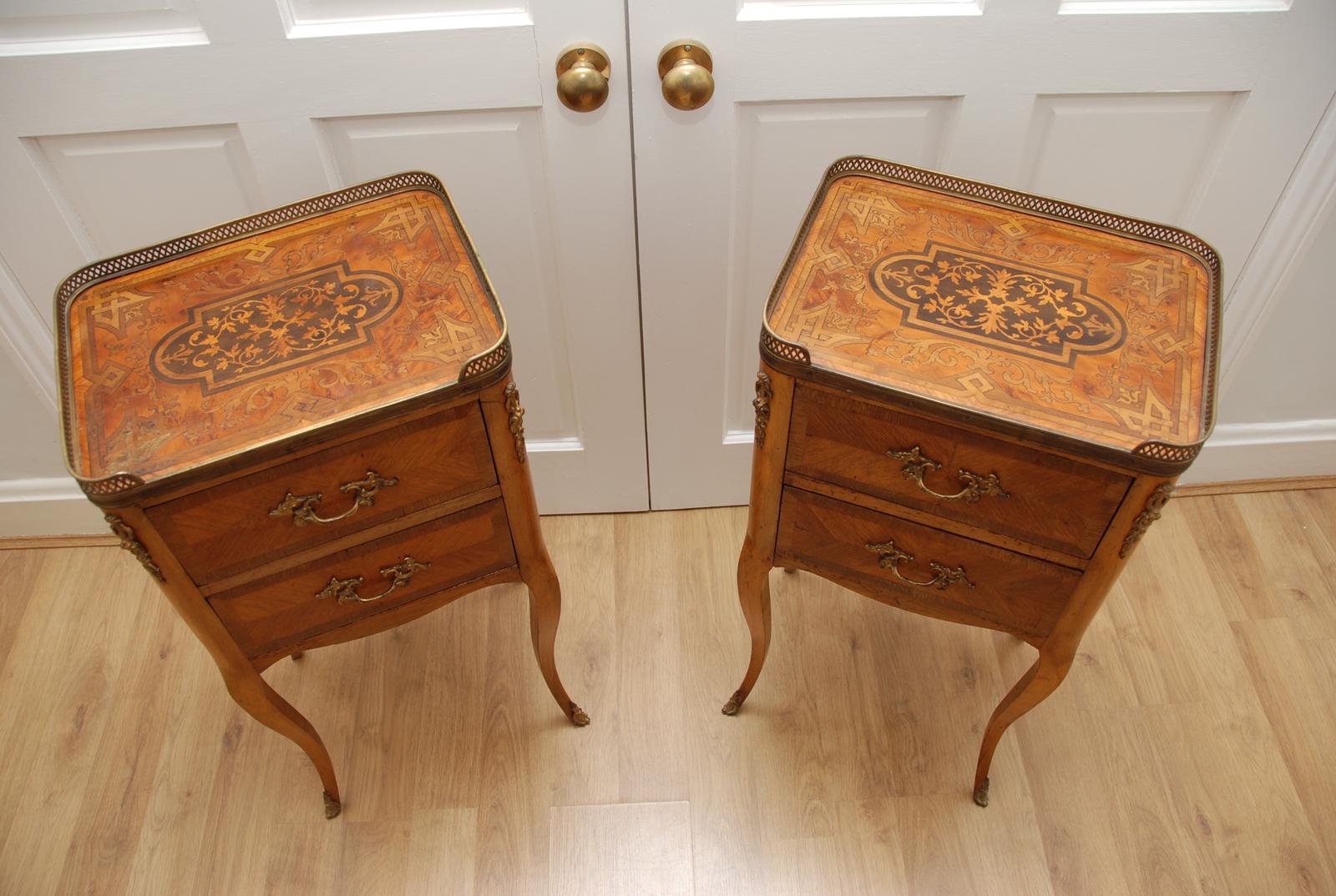 Antique Pair Kingwood and Inlaid Two Drawer Bedside Tables on Cabriole Legs