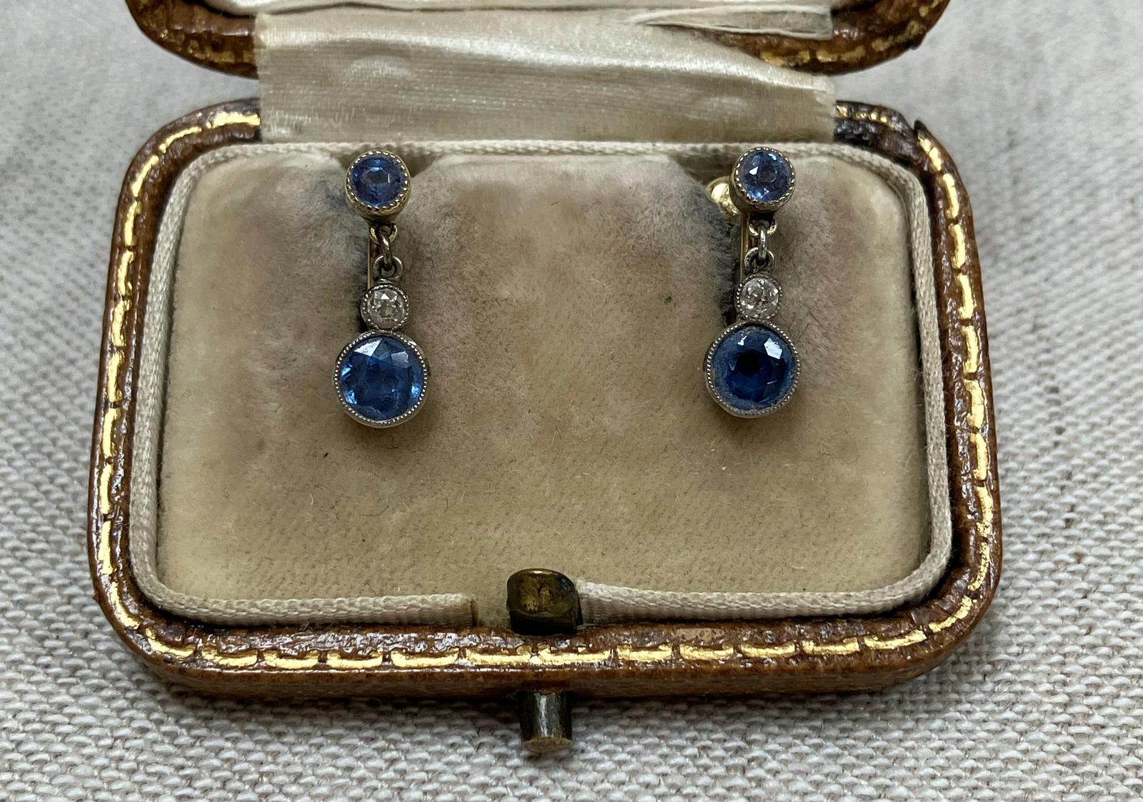 Antique Pair Of 15ct Gold Round Cut Sapphire & Diamond Drop Screw Back Earrings