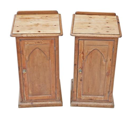 Antique Pair of 19th Century Victorian Gothic Bedside Tables – Quality Nightstands A pair of 19th-century Victorian Gothic bedside tables, full of age, character, and patina. This rare decorative find features fantastic Gothic arched doors and is structurally sound, making it practical for use as bedside tables, side tables, or decorative accent pieces in period or contemporary interiors. Features & Craftsmanship Softwood construction Structurally sound with no loose joints Age: 19th century Dimensions (each table) Width: 41 cm Depth: 42 cm Height: 71 cm (plus 3 cm upstand) Condition Report In good antique condition, showing expected signs of age including historic knocks, marks, cracks, imperfections, repairs, and alterations consistent with functional period furniture. Some historic extinct woodworm holes — treated for good measure. Doors have working catches. Additional Information Stock Number: 8804 Guarantee: 30-day no-quibble money-back guarantee Shipping: Competitive, reliable UK and international door-to-door delivery available An excellent opportunity to acquire a pair of Victorian Gothic bedside tables that combine period charm with practical functionality.