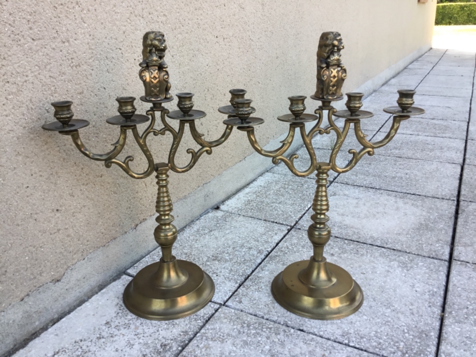 Antique Pair of Brass Candelabras with Amsterdam Lion Finials C.1880
