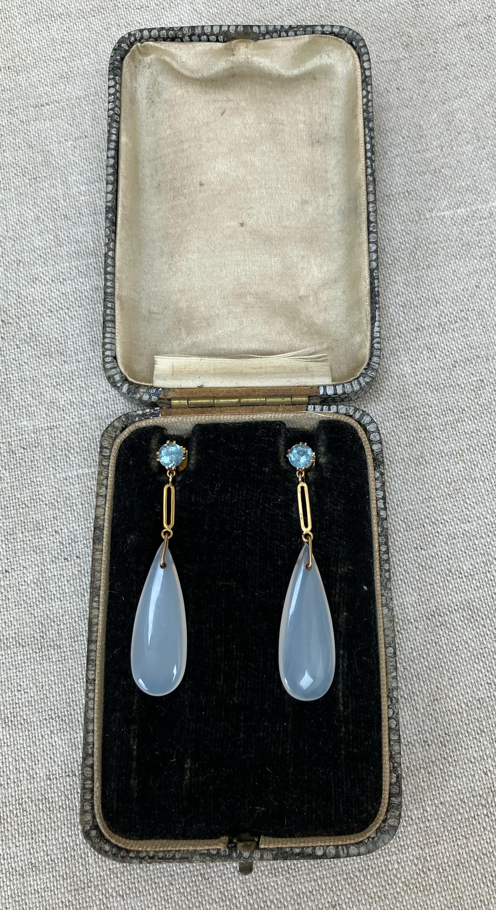 Antique Pair of Chalcedony & Blue Spinel Gold Drop Screw Back Earrings