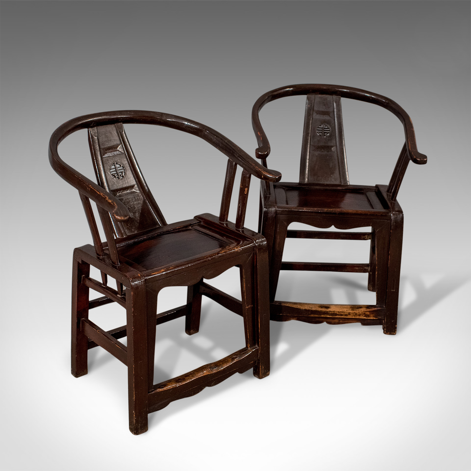 Antique Pair of Chinese Oriental Asian Carver Elbow Horseshoe Armchairs C.1890