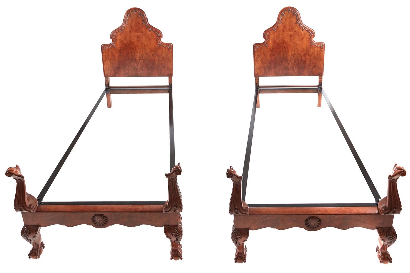 Antique Pair of Fine Quality Carved Burr Walnut Single Beds c.1920