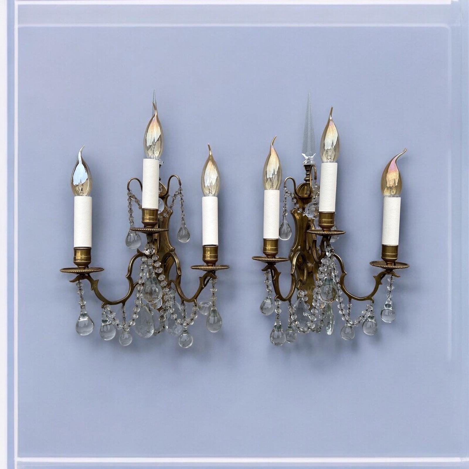 Antique Pair of French Brass Wall Lights with Crystal Swags