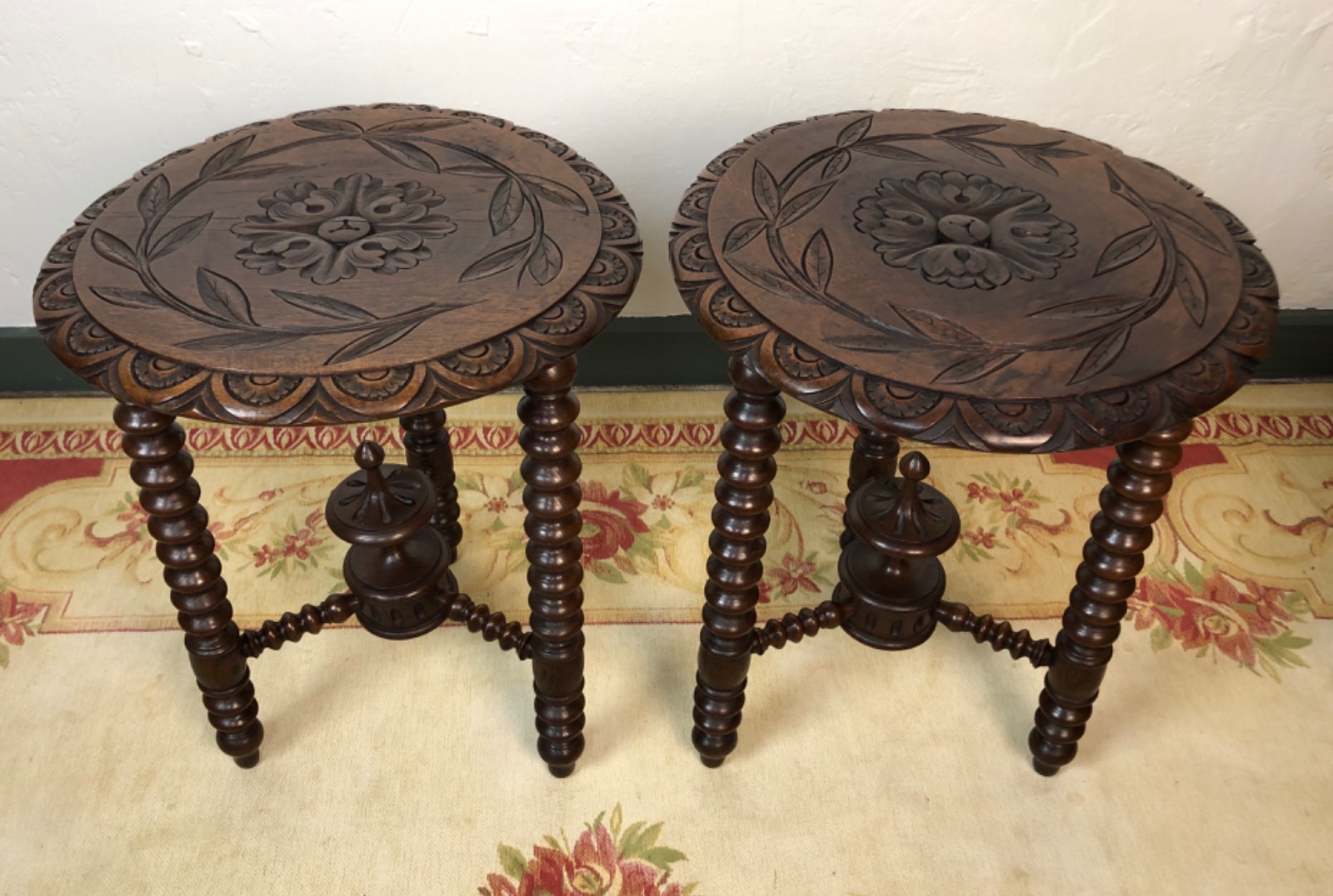 Antique Pair of Gypsy Bobbin End Tables with Carved Tops 19th Century