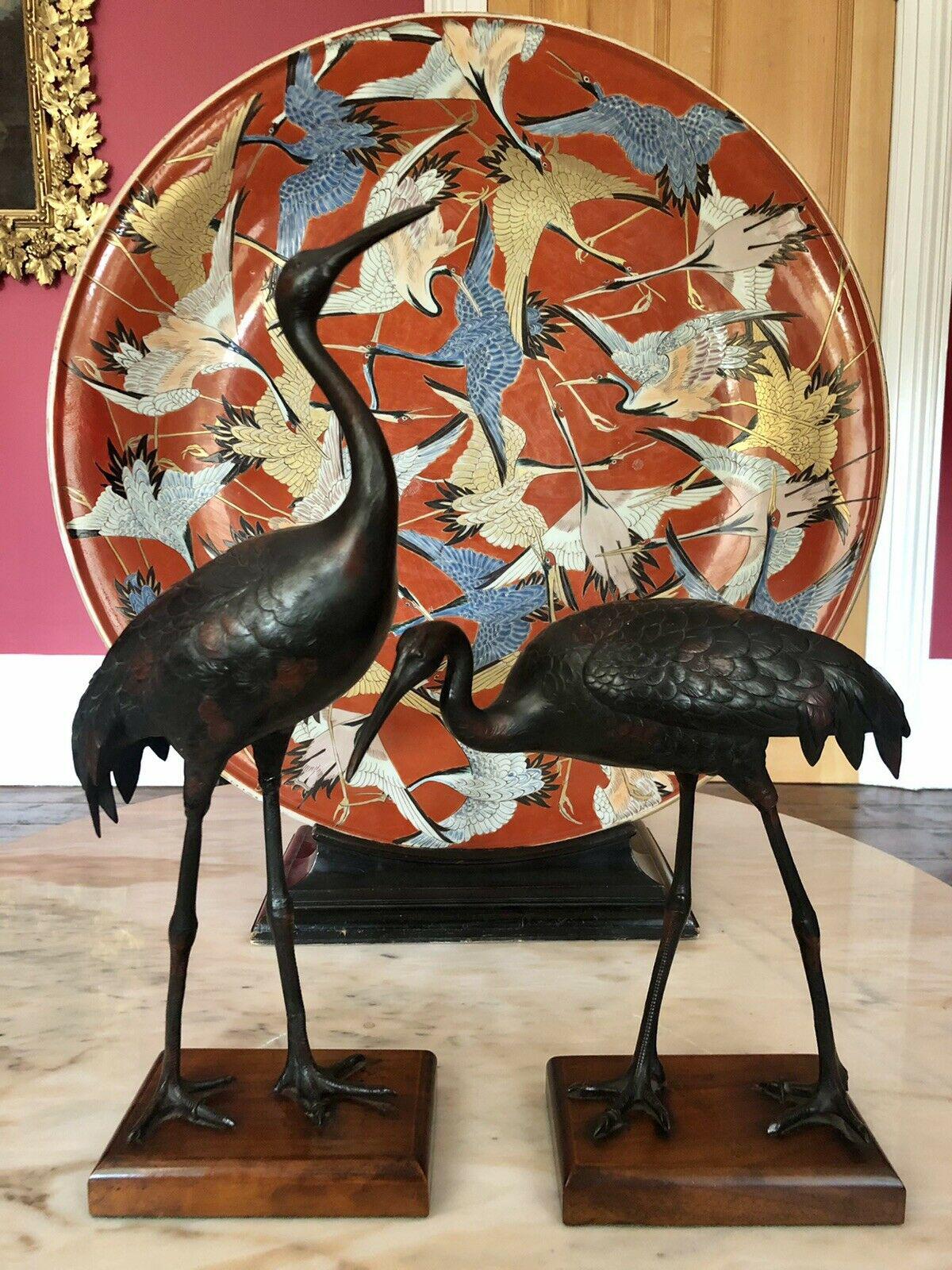 Antique Pair of Japanese Bronze Metal Crane Sculptures