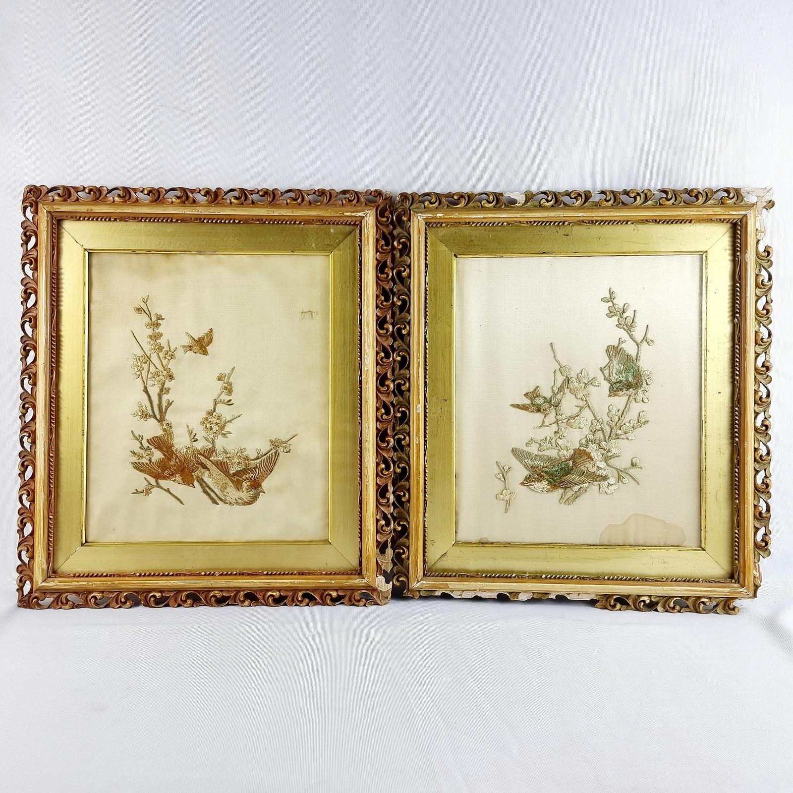 Antique Pair of Japanese Silk Embroidery of Birds Kyoto