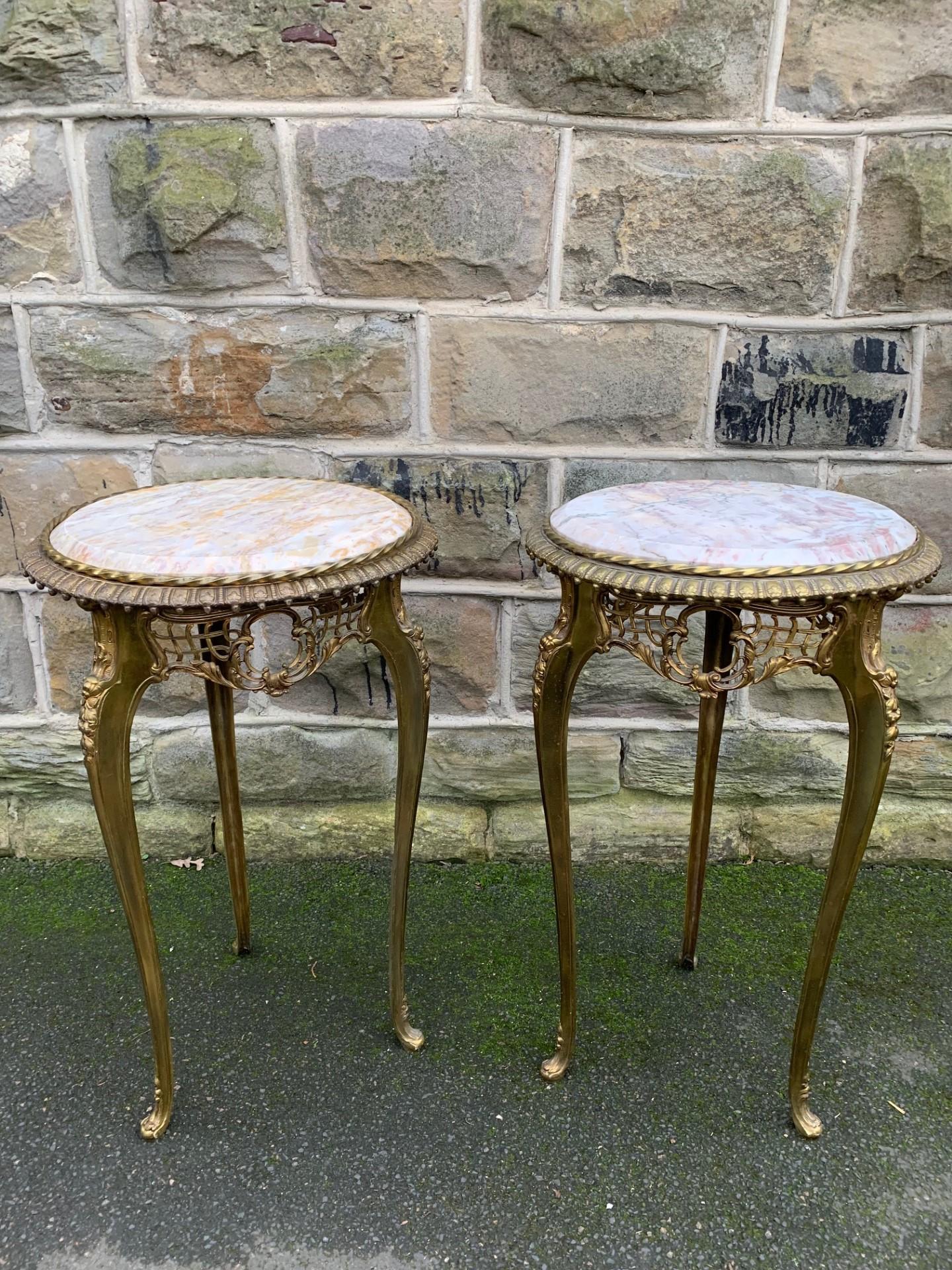 Antique Pair of Marble Top Gilded Brass Tables Stands