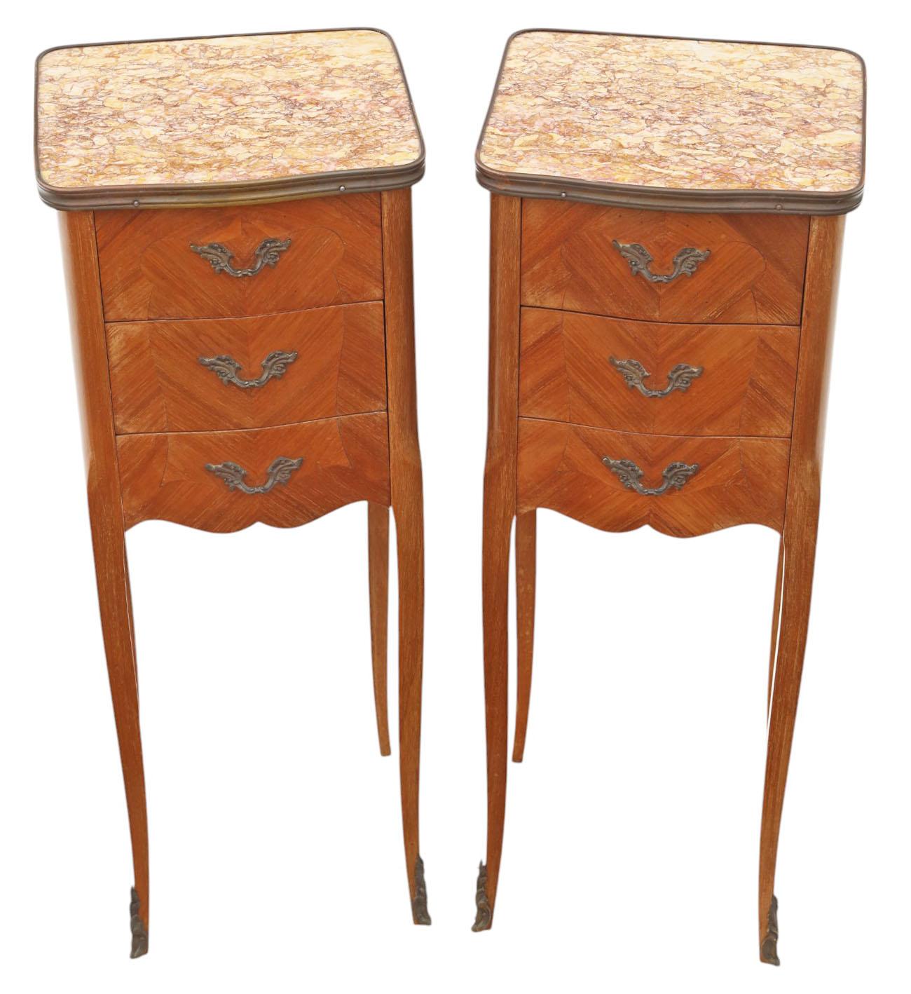 Antique Pair of Small Marquetry Bedside Tables with Marble Tops – Quality Nightstands, Early 20th Century