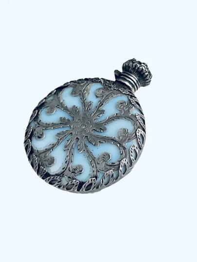 Antique Palest Blue Opaline Disc Form Perfume Scent Bottle with Sterling Silver Overlay c.1880