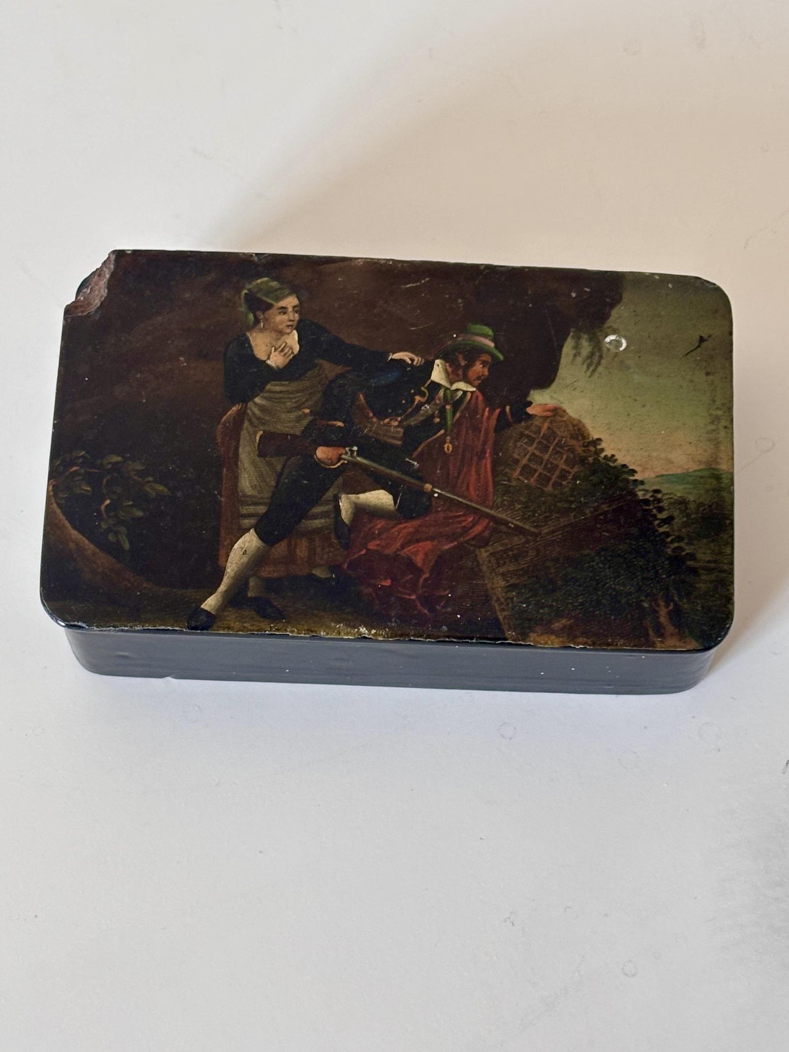Antique Papier Mache Snuff Box Painted with a Couple Hunting in Military Uniform