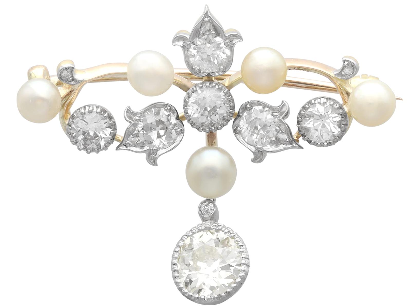 A stunning, fine and impressive antique pearl and 3.54 carat diamond, 9 karat yellow gold and platinum set drop brooch; part of our diverse pearl jewelry collection.