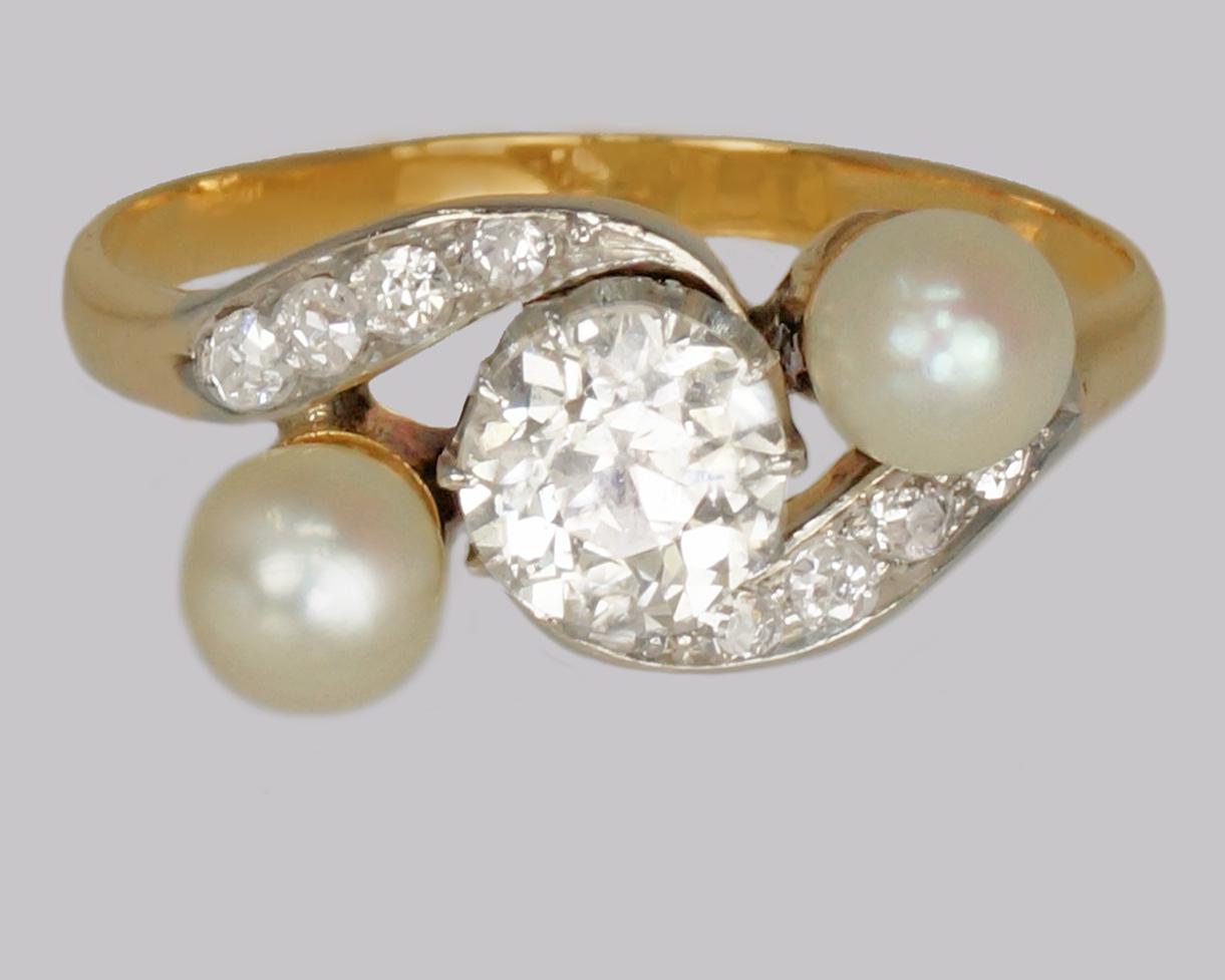 Antique Pearl & Old Cut Diamond Twist Ring 18ct Gold Edwardian Trilogy Ring c.1910