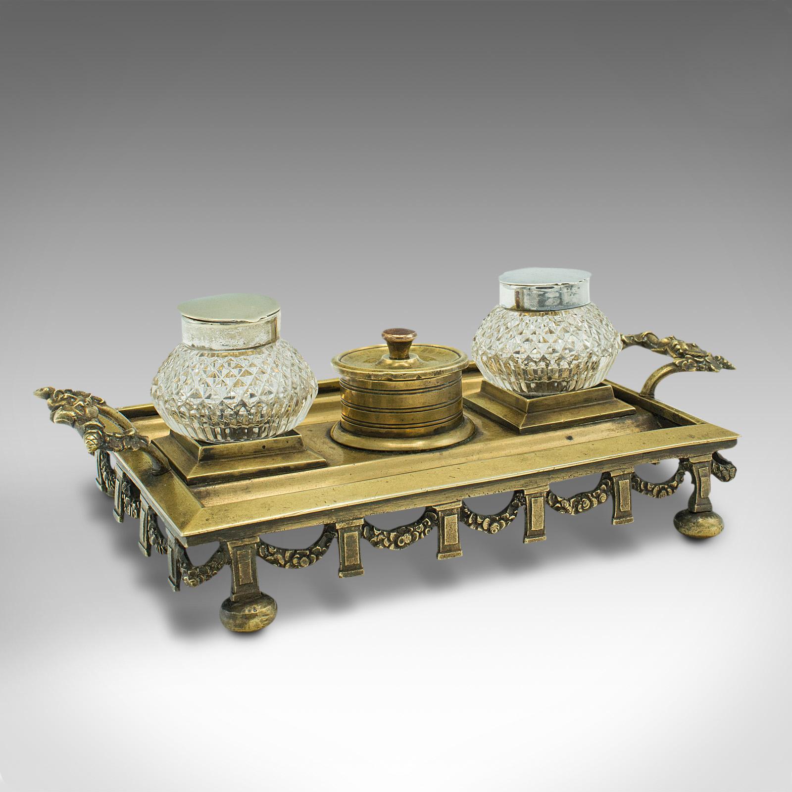 Antique Pen Tray, English, Brass, Silver Plate, Inkwell Stand, Edwardian c.1910