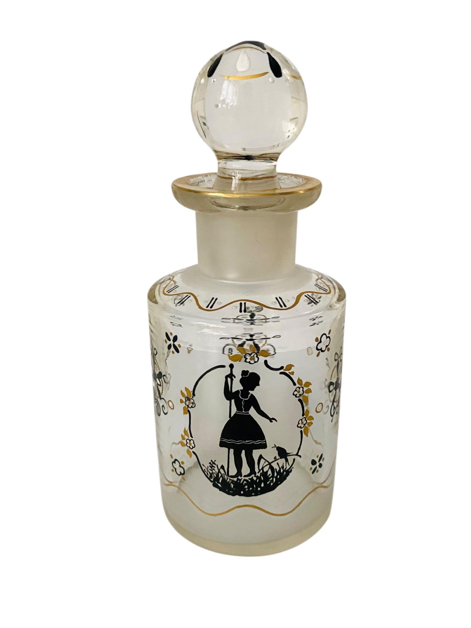 On offer is this fine antique Bohemian glass perfume bottle dating circa 1900 and measuring approx. 15 cm in height and 6 cm in diameter. This antique scent bottle is made of clear glass with pretty hand applied gilt black and white raised enamelled decoration to the bottle and the globular stopper. The front of the bottle has s a silhouette design featuring a young woman holding a staff and reaching out with one hand towards a singing bird.