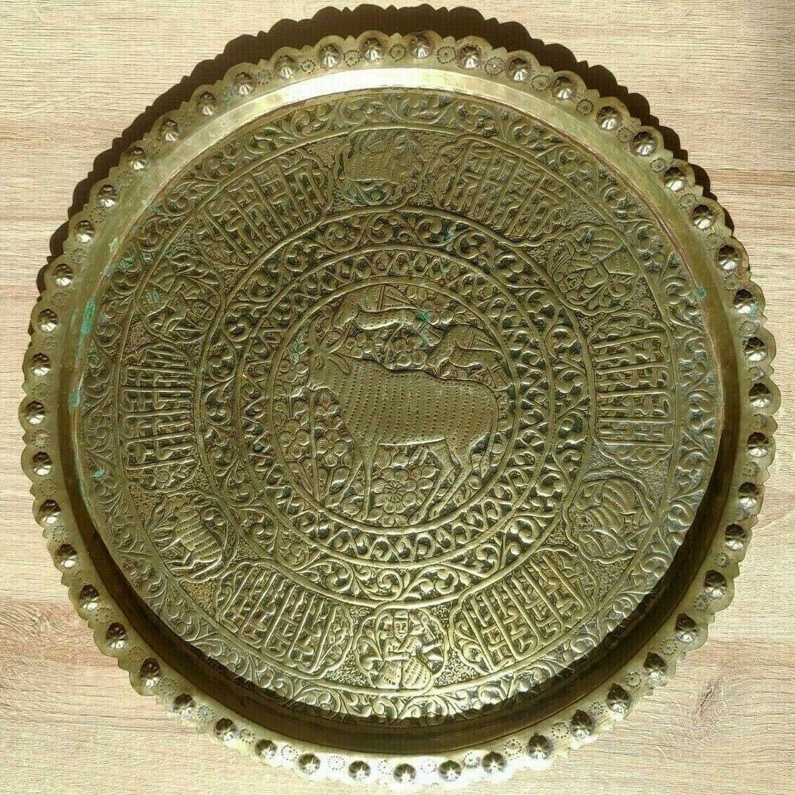 Antique Persian Qajar Embossed Brass Tray Islamic Middle East Calligraphy - 45cm