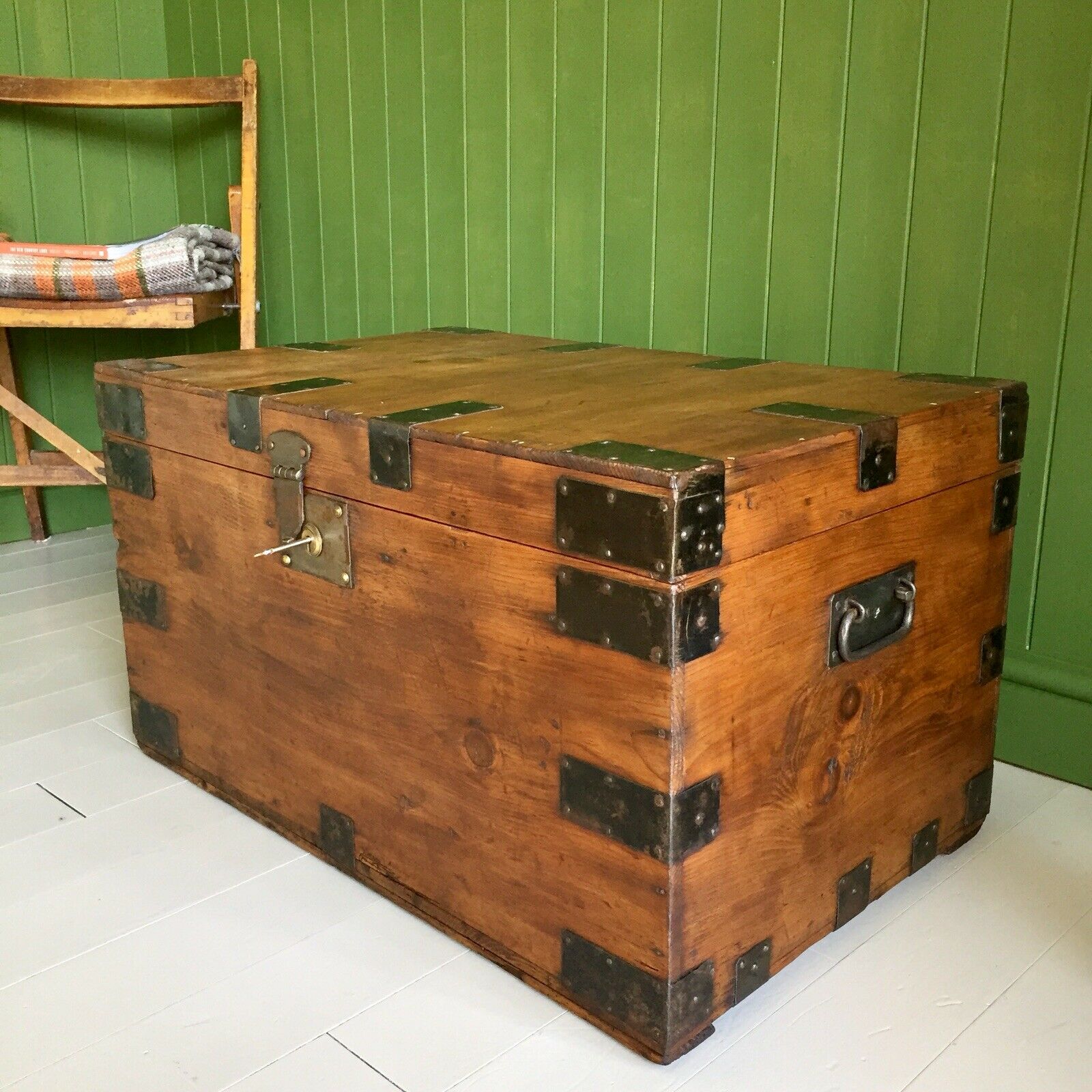Antique Pine Chest Victorian Wooden Carriage Trunk Coffee Table Rustic Storage Box + Key