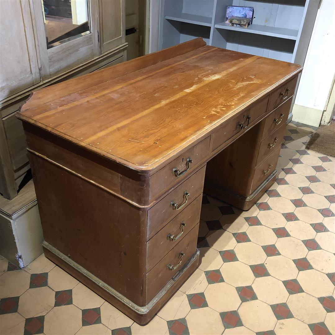 Antique Pine Pedestal Knee Hole Desk Nine Drawers