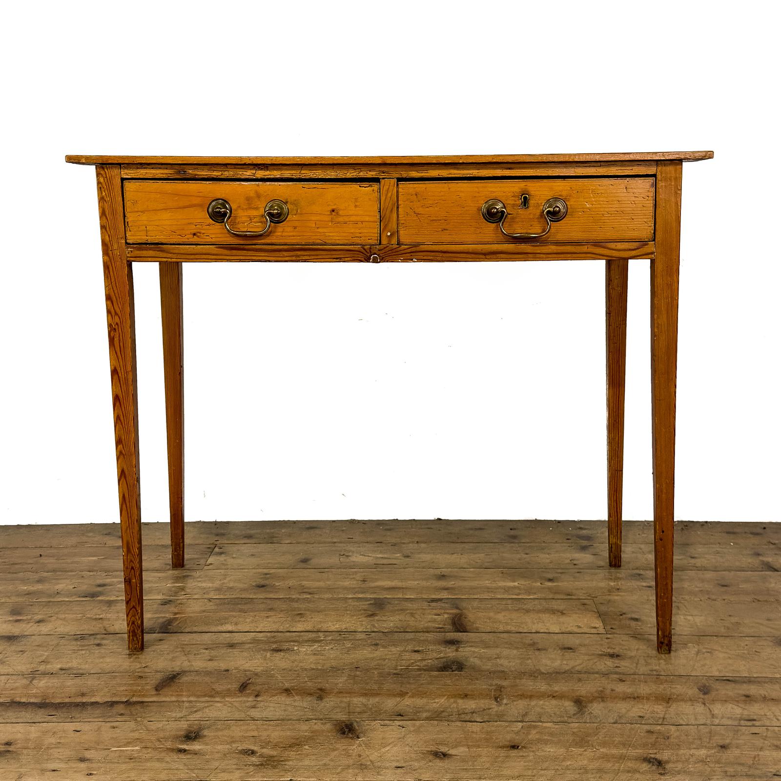 A well presented antique pine side table. The table features a rectangular top above two drawers, each fitted with brass handles, offering useful storage. Raised on slender legs, giving it a light and elegant appearance. Constructed from pine with a warm, natural colour and pleasing grain throughout. A practical piece with useful small proportions, ideal as a side table, writing table or console.