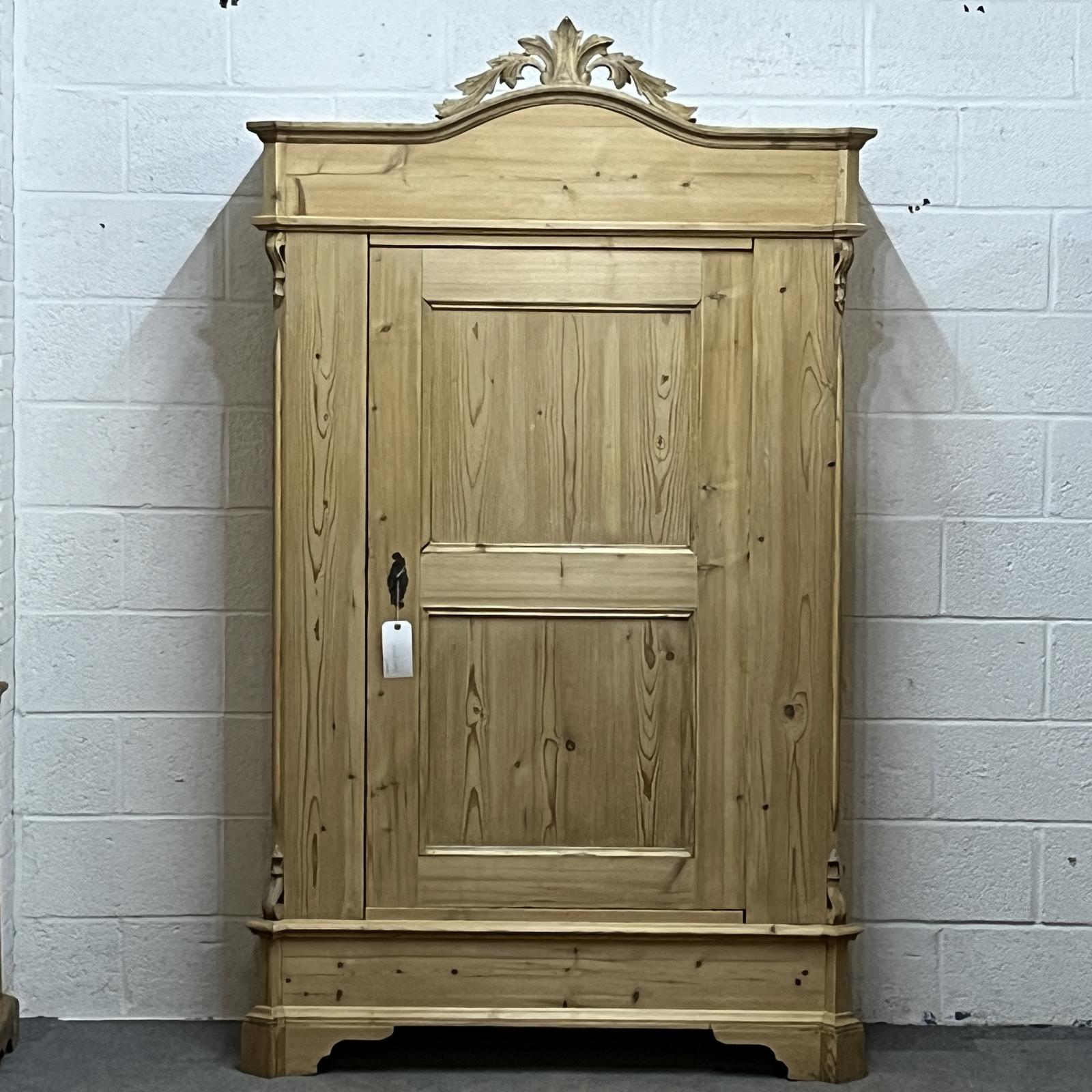 Antique Pine Wardrobe with Single Door and Ornate Crown
