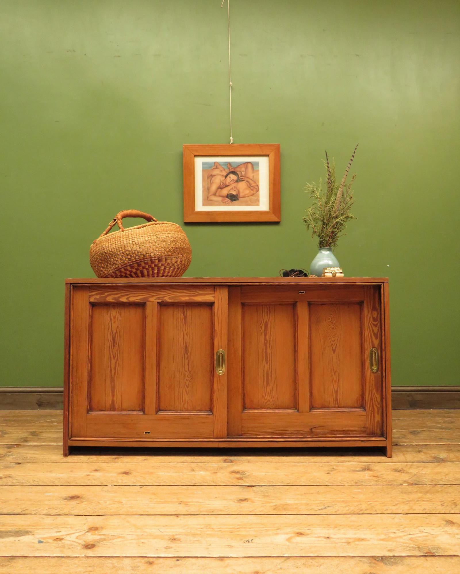 Antique Pitch Pine Low Filing or Record Cabinet with Sliding Doors